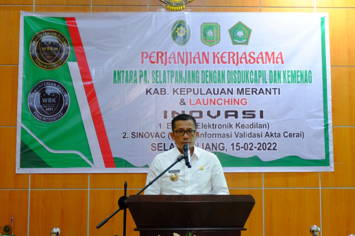 Selanjutnya Bupati Meranti H Muhammad Adil SH mengatakan dalam acara tersebut bahwa, Atas nama Pemerintah Kabupaten Kepulauan Meranti kami mengucapkan terima kasih dan memberikan apresiasi kepada Pengadilan Agama Selatpanjang, Dinas Kependudukan dan Pencatatan Sipil Kabupaten Kepulauan Meranti, dan Kantor Kementerian Agama Kabupaten Kepulauan Meranti yang telah membantu pemerintah dalam menciptakan aplikasi E-ADIL dan SINOVAC untuk masyarakat Kabupaten Kepulauan Meranti.